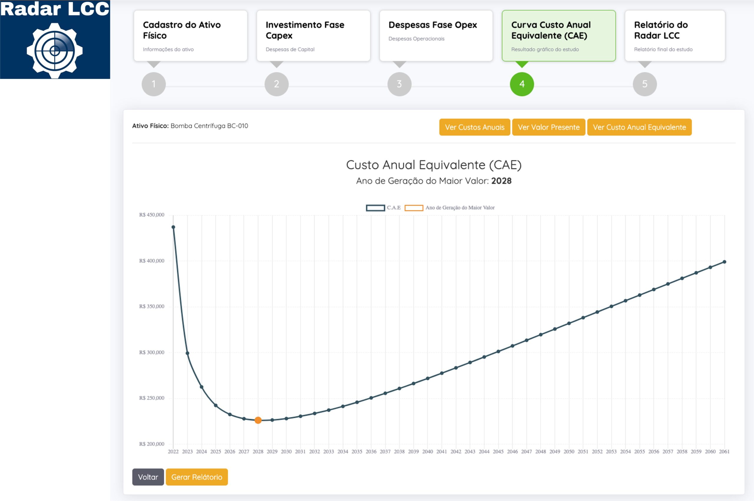 Com os dados conhecidos dos custos de capital (CAPEX) e custos operacionais (OPEX), o Radar LCC garante a gestão da vida econômica dos ativos físicos. A partir do fornecimento desses dados financeiros, o software gera a curva do Custo Anual Equiavalente (C.A.E), com a qual é possível identificar a Vida Útil Remanescente (VUR) do equipamento em questão.